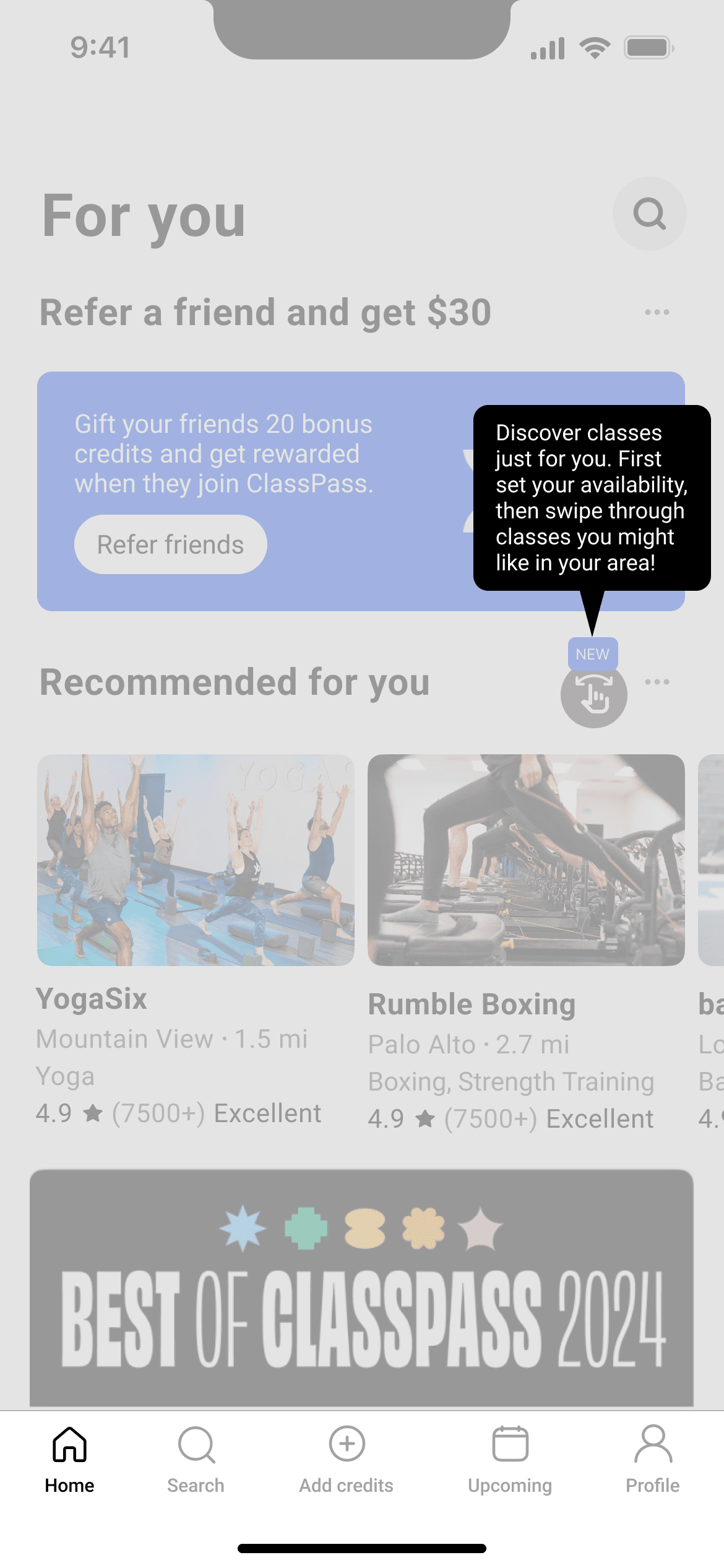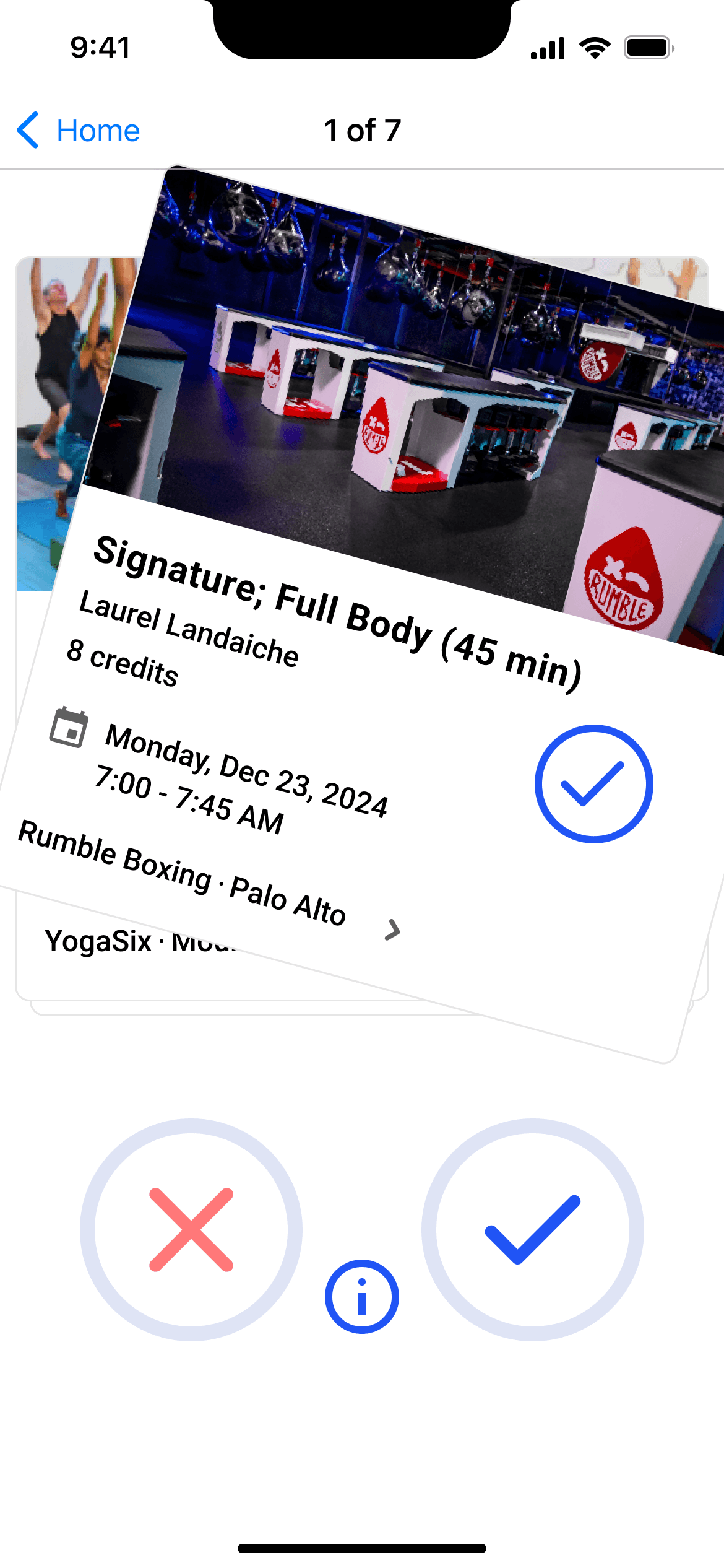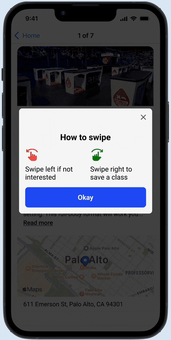 Swipe feature to discover new classes and studios, ultimately supporting the diversification and stability of Classpass