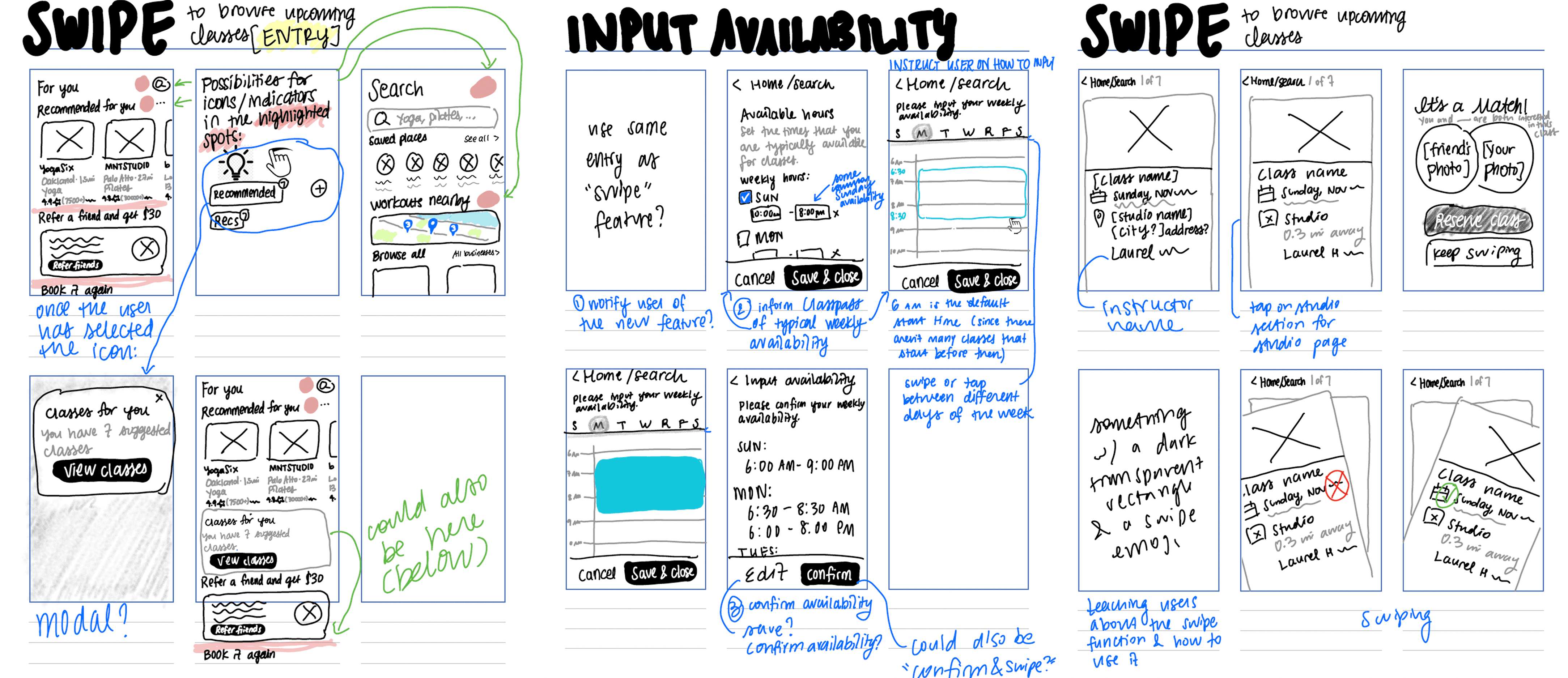 My next step was getting in the weeds and sketching out UI possibilities. I focused on the swipe function and availability input.