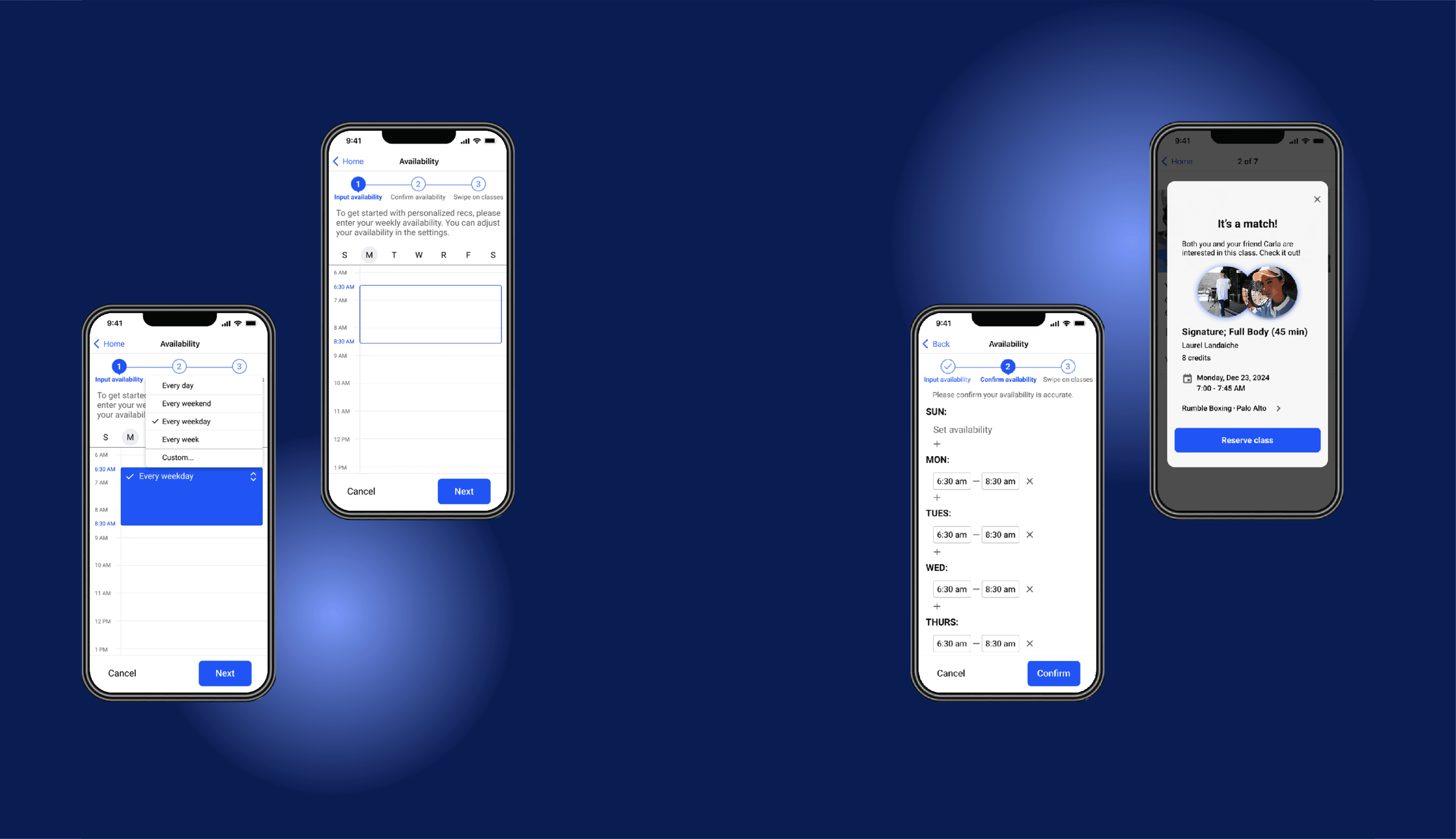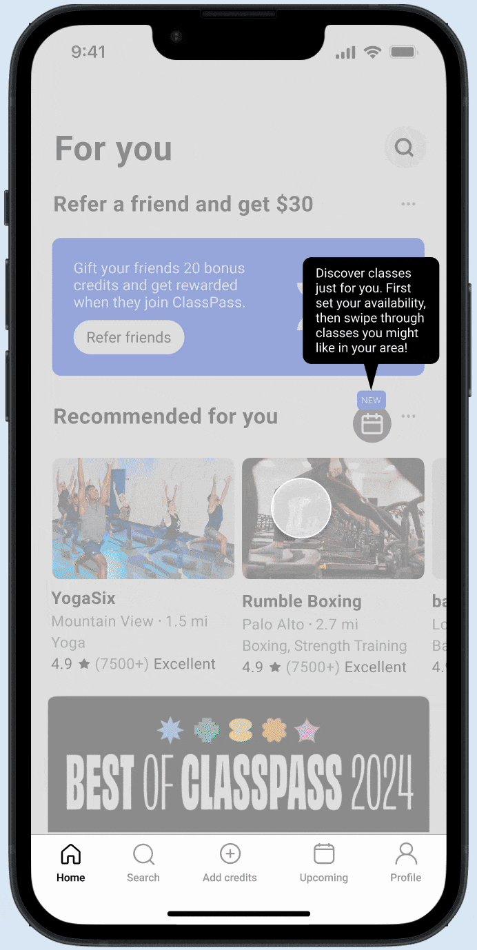 Designing an availability and swipe feature for Classpass to diversify studio contacts, spice up fitness routines, and enhance friendships through facilitating hangouts.
